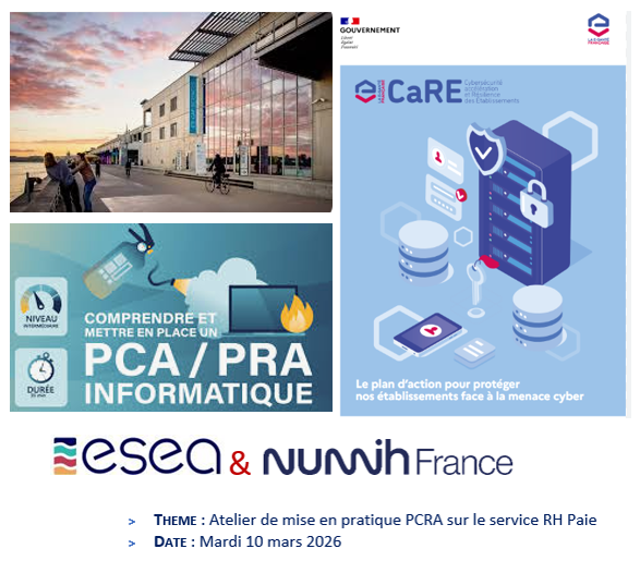 Deux salariés du service administratif ont participé à un atelier de mise en pratique du PCRA (Plan de Continuité et de Reprise d’Activité) organisé par NUMIH France et ESEA sur la thématique RH-PAIE.