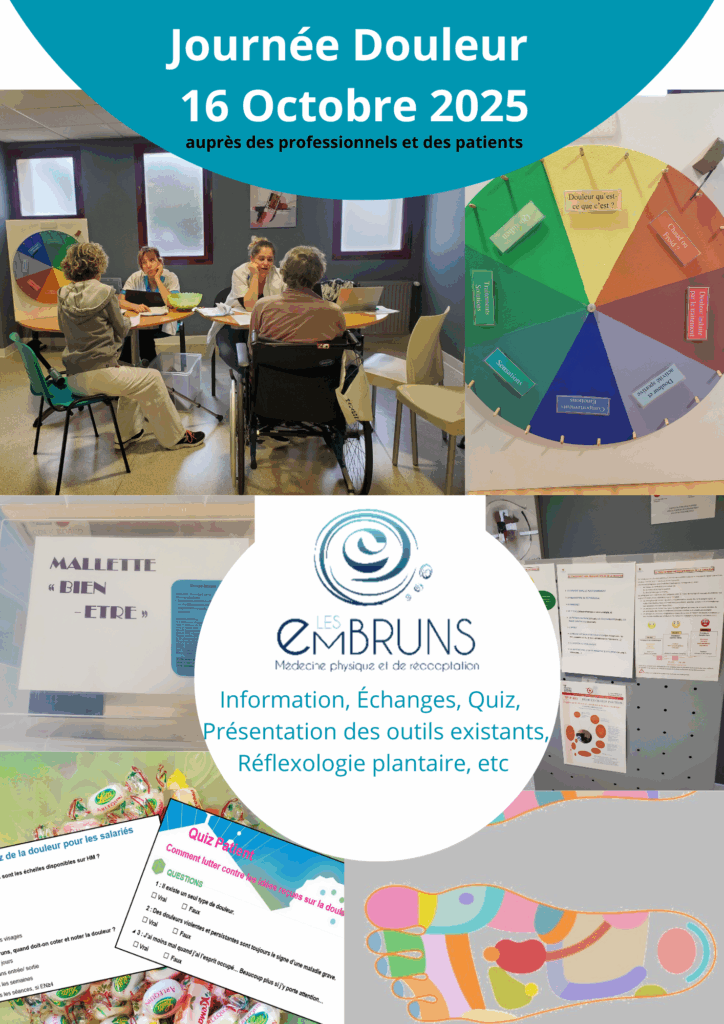 A l’occasion de la journée mondiale de la Douleur 2025, l’établissement des Embruns a organisé différents stands (quiz, roue de la Douleur, espace échange, réflexologie plantaire).